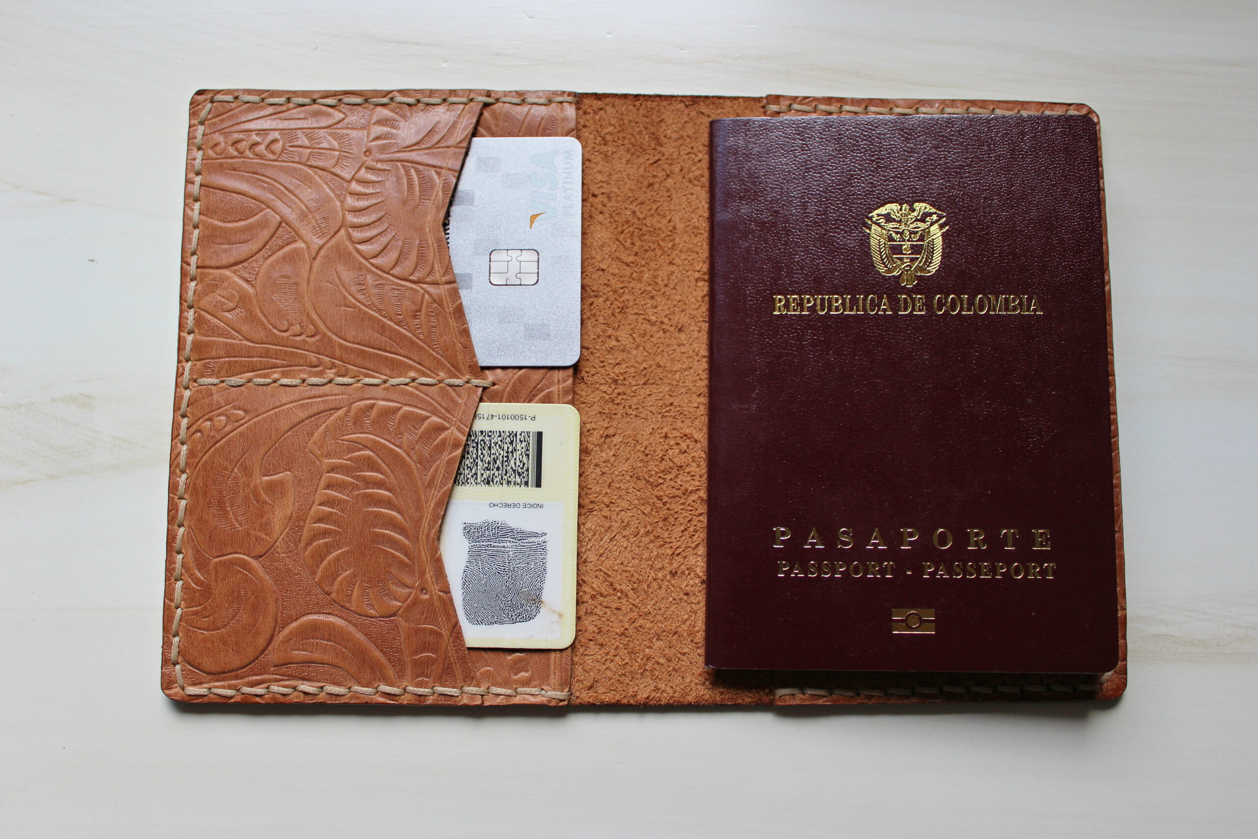 Cuenta con dos compartimentos para ubicar un pasaporte en cada uno de ellos y con dos tarjeteros donde puedes poner tu documento de identificación y tarjetas.