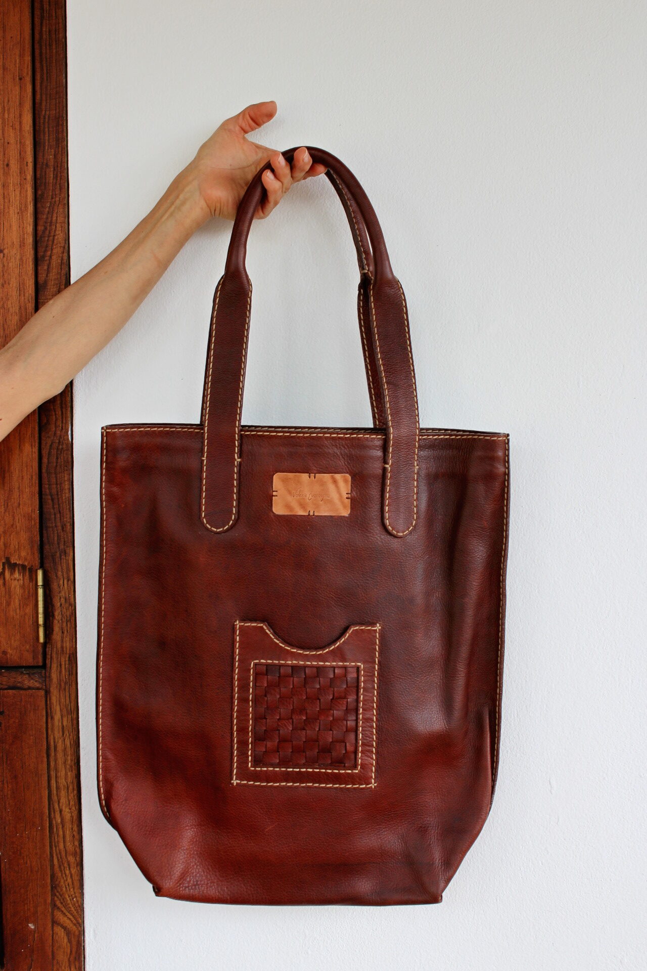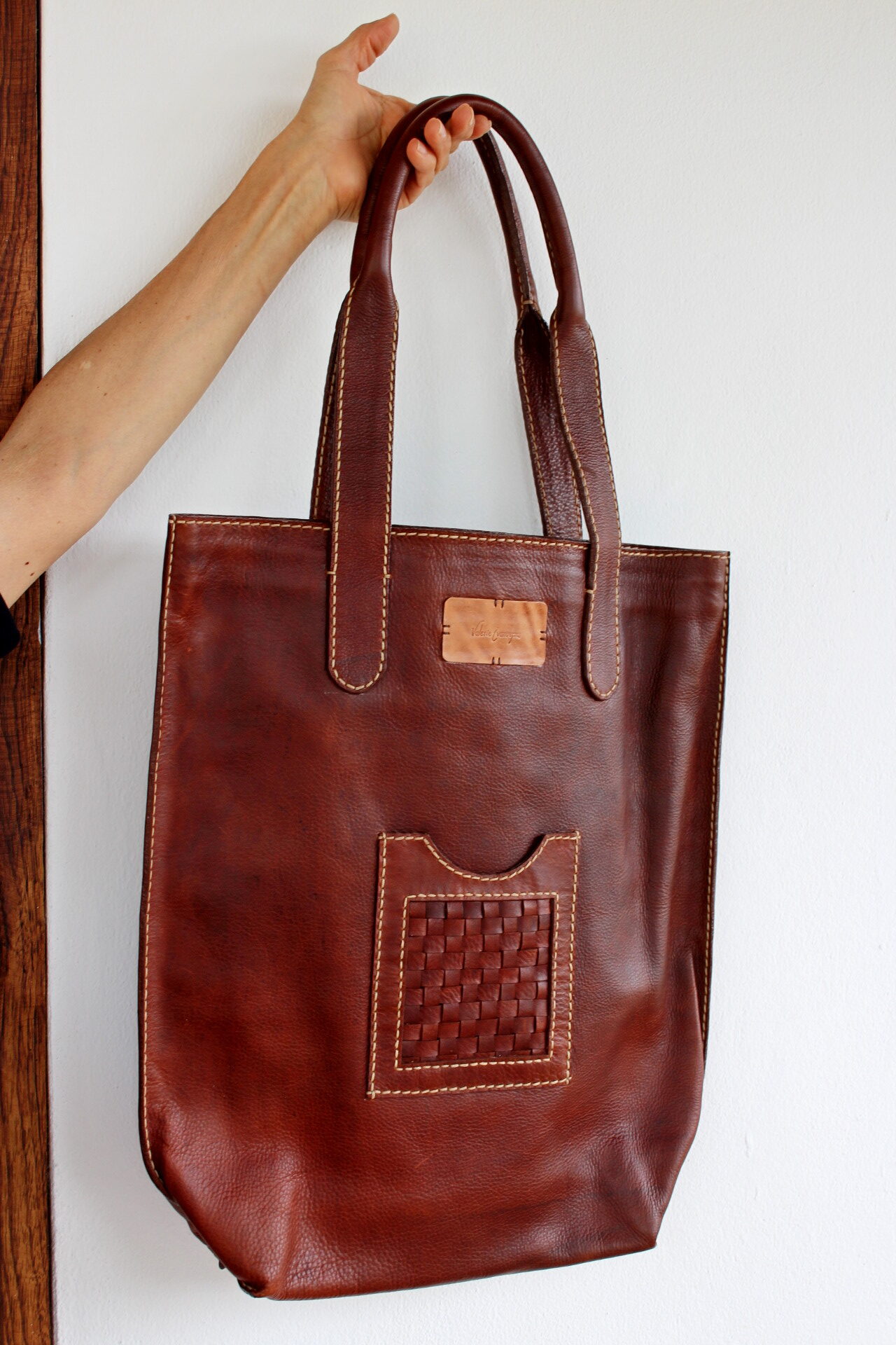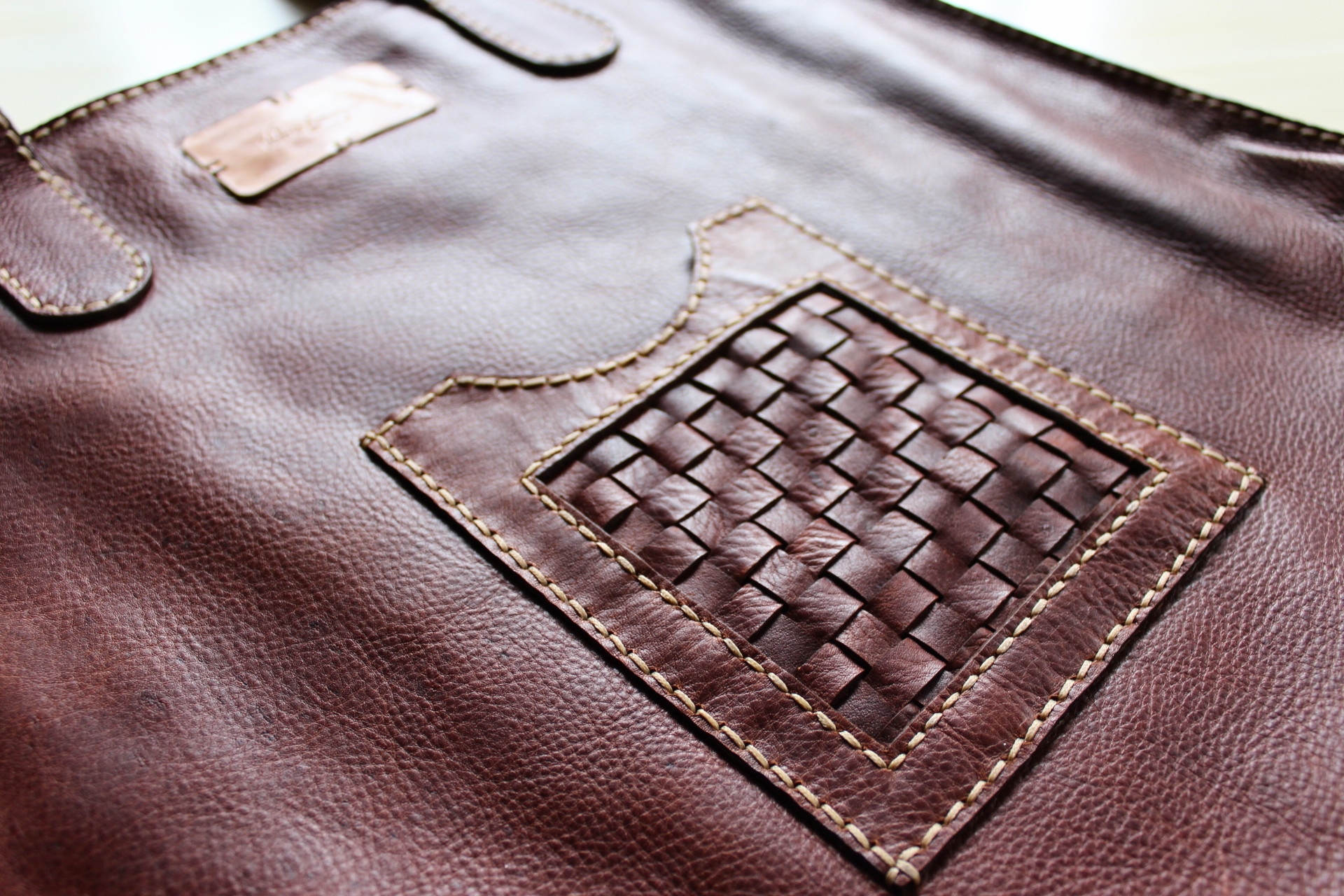 Este bolso resalta por la belleza de su cuero semigraso, por sus costuras escalonadas hechas completamente a mano, por su bolsillo tejido en el frente y sus finos acabados.